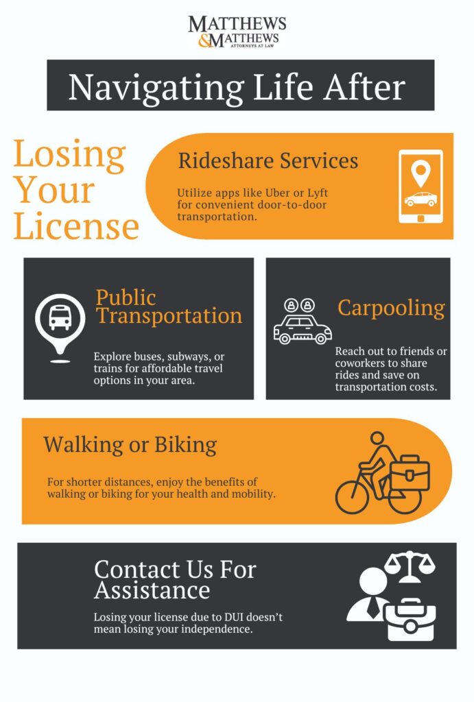 Losing your license after a DUI can be a daunting experience, impacting your ability to get to work, run errands, or attend social events. At Matthews & Jones, we understand that DUI consequences can feel overwhelming. However, there are practical solutions to help you navigate daily life without your driving privileges.