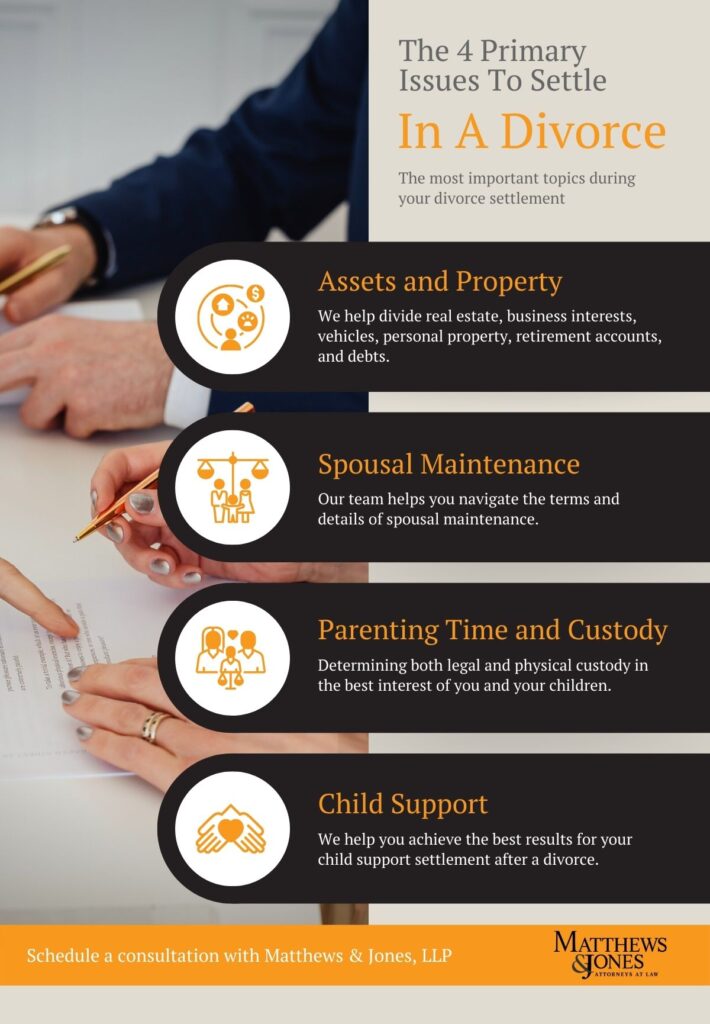 After the difficult conclusion that marriage is no longer sustainable and you have decided to pursue a dissolution action, there are still legal matters that must be settled. If you seek legal advice and guidance through your divorce proceedings in Florida, consult the team at Matthews & Jones, LLP to settle the terms associated with your separation. Contact us today to discuss the specifics of your case and keep reading to learn more about the primary issues to settle after your divorce.
